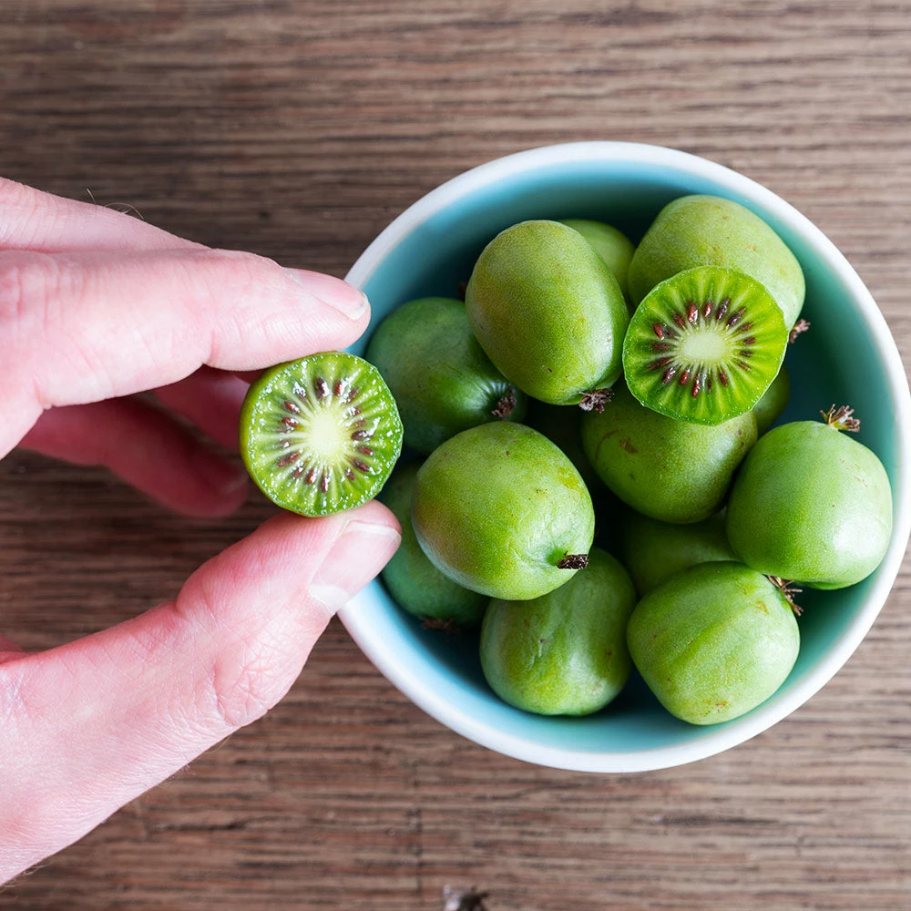 The Anna Hardy Kiwi has a complex flavor profile that is sweet yet tart and tangy, resembling the taste of pineapple. With their smooth, firm skin and smaller grape-like size, Anna Hardy Kiwis are perfect for picking right off the vine for snacking. Best of all, this kiwi variety has skin that is smooth and free of the signature fuzz found on other kiwi varieties. Just pick from the abundant harvest of this high-yield Kiwi and enjoy its fresh, exotic fruit without having to peel it first!