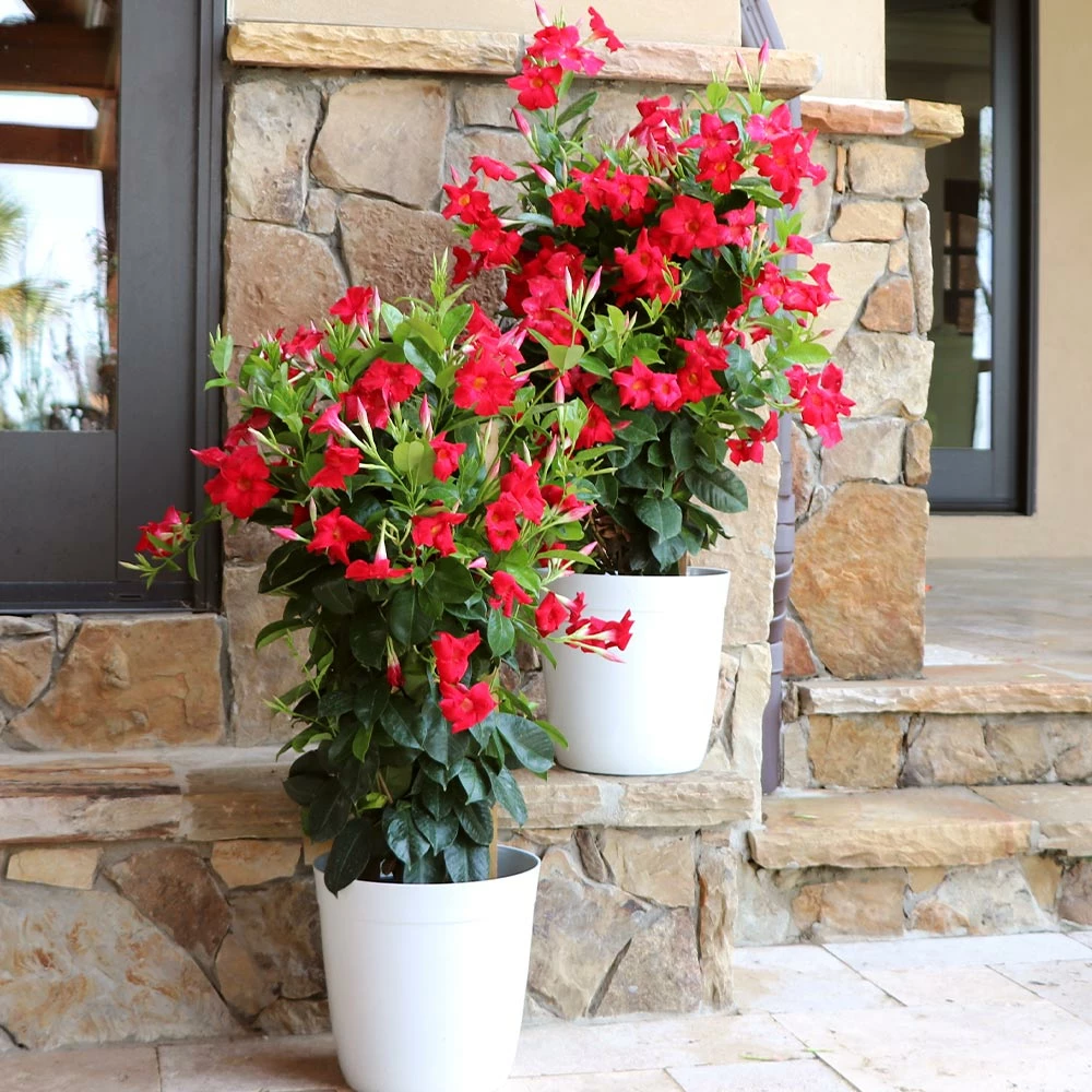 With just a little care, you can enjoy years and years of dramatic crimson blooms. Mandevillas enjoy full sun with a well-drained moist soil. Allow the soil to dry out in the top 3 inches before watering. Apply a balanced organic liquid fertilizer every two weeks in the growing season for optimal flowering and growth. Plus, you can easily prune without shears by simply pinching. You can pinch off deadheads to encourage constant blooming. And you can even pinch back new vine growth to give your plant a more bushy feel.
