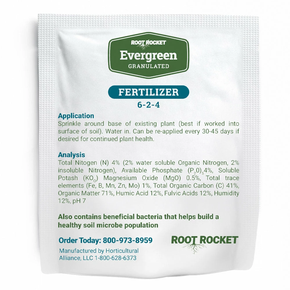 This blend is specially formulated for evergreen maintenance, and keeps your trees growing fast and healthy. A 6-2-4 blend of Nitrogen, Phosphorous and Potassium, this fertilizer also includes beneficial microbials that promote healthy plants and soil, while protecting against plant stress.