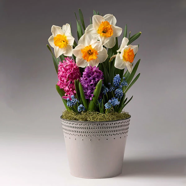 Bring the beauty of spring to your home with the Pure Magic Bulb Garden. A complete collection of abundant blooms, this arrangement includes 2 Gentle Giant Narcissuses, 1 Purple Voice Hyacinth, 1 Pink Pearl Hyacinth, and 4 Blue Magic Muscaris.